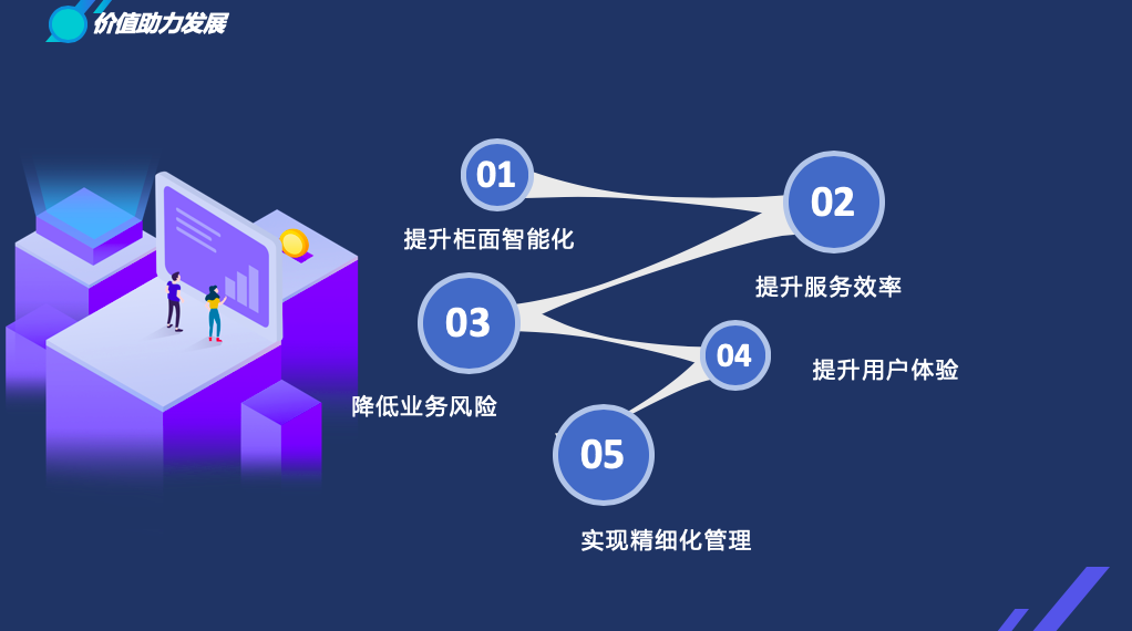 系統操作方面(miàn)簡潔、易于上手且支持對接人臉識别、語音識别、圖像識别、二維碼管理等功能(néng)。全面(miàn)提升櫃面(miàn)智能(néng)化程度與服務效率,降低業務風險提升用戶體驗。以客戶爲中心設計理念,持續優化業務流程,提高客戶服務水平和精準營銷能(néng)力;面(miàn)向(xiàng)銀行線下和線上服務全渠道(dào);整合網點、自助渠道(dào)和移動渠道(dào)服務并實現網點精細化管理,控制業務風險,依托并整合銀行後台資源和能(néng)力,全面(miàn)提升網點、自助渠道(dào)和移動渠道(dào)的綜合服務能(néng)力。